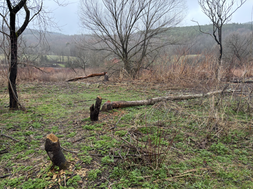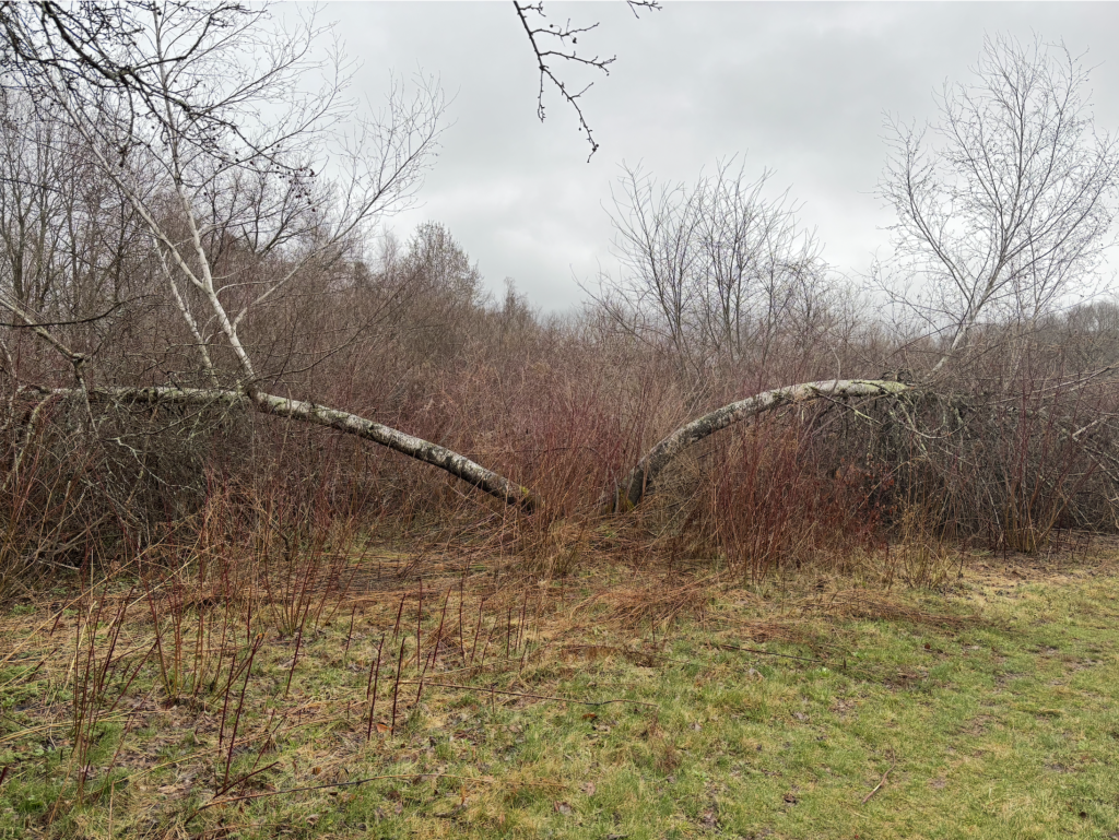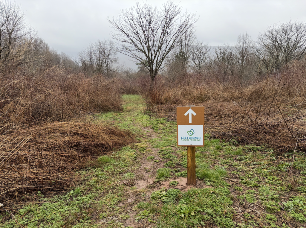 With all the snow gone, it was time for a spring inspection of the trail around the East Branch Nature Preserve this week and there were a few surprises. A stand of birch (pictured above) in the switch-back turn in the northernmost part of the trail by the outdoor classroom were almost completely prostrate, as if they were frozen in time while taking their last bow to the audience. It’s likely they were dying and buckled under the weight of snow. There is another stand of birch nearby unscathed.