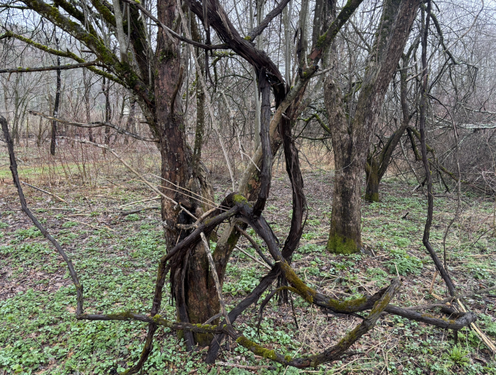 The lack of foliage and snow revealed more vines: black, gnarled, and striated, they wound around trees like the crab apples and ironwoods. This is not a common sight in the Catskills, especially seeing specimens that are so ancient looking – mummified, like they belong in the last Roman Empire. Who planted them and when?