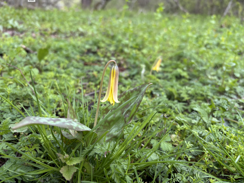 We are roughly one month into spring, with the spring ephemerals surviving despite the snow flurries and low temperatures yesterday. We have a patch of trout lilies, a little wilted but hanging in there: