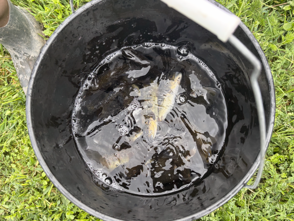 Today, the river was high due to last night’s epic storm that saw tornado warnings and a solid half hour of extraordinarily lively lightning that ushered in torrential rain. This morning it was humid and still, with a high temperature of 59F. At least one trout was spotted by the banks of the river.