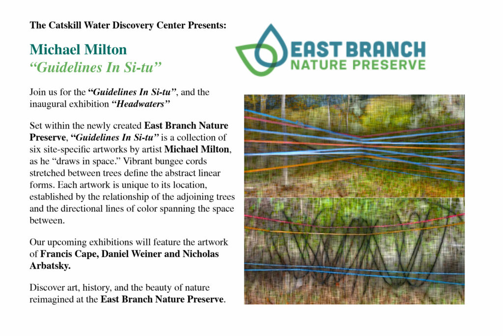 The East Branch Nature Preserve is also an outdoor exhibition space with visiting exhibits that integrate art and nature. Michael Milton’s “Guidelines In Si-tu” is a featured installation at the East Branch Nature Preserve and was recently extended at the end of 2025 with a few new pieces. All are welcome to visit this installation as the East Branch Nature Preserve is open year-round.
