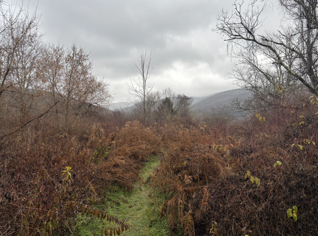 Goldenrod is a main stay of summer, during which they bloom with brilliant, vivid yellow, hand-sized draping clusters of blossoms atop tall rods, about three to six feet high. Thin leaves, two to six inches long, grow all the way down the stem alternately, and are hairy. Goldenrod grows by rhizome and you’ll usually find whole fields of it. Our Preserve was no exception. This is what a large patch looked like in November last year, with the trail winding through it.