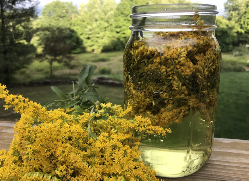 The flowers don’t freeze well, so if you want to save some tea for winter, make a condensed batch and freeze to dilute later with water. To make a condensed batch of tea, simply soak as much fresh goldenrod as you can fit in a mason jar of hot water. Strain through a sieve and freeze.